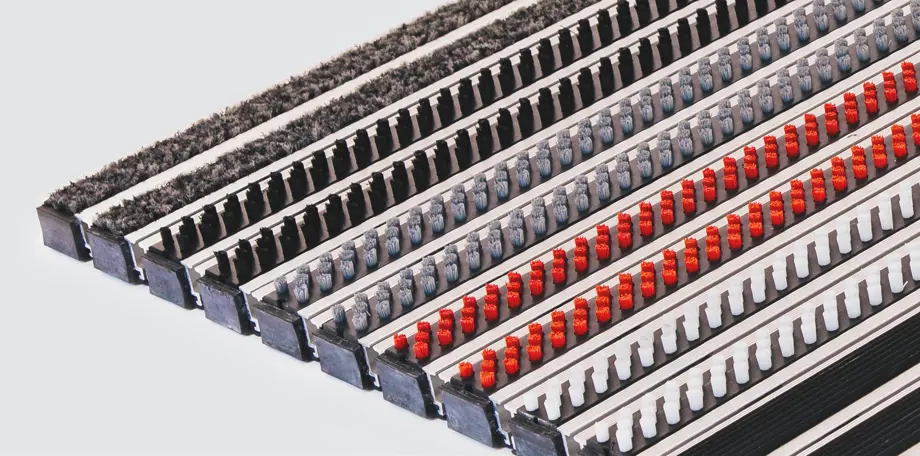 The Kabe Combi is a high-heel friendly, hardwearing combination mat, which can be rolled up, with black, grey or red brushes. The Combi entrance mat is an excellent alternative to the Kabe Original for environments heavily trafficked, for example, by shopping trolleys. The brushes can be replaced by, or combined with, textile and rubber strips. The underside is provided with rubber strips to keep the mat stationary on the surface and dampen the sound of footsteps. Kabe Combi is just as suitable for indoor as for outdoor use.