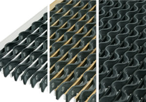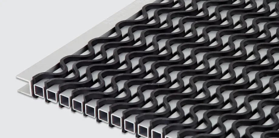 The reinforced version of the Kabe Original entrance mat is recommended if the mat is to be placed in environments where there is wheeled traffic or sloping floors combined with studs in the substrate. The reinforcement consists of rubber bushes that are threaded on the steel wires.